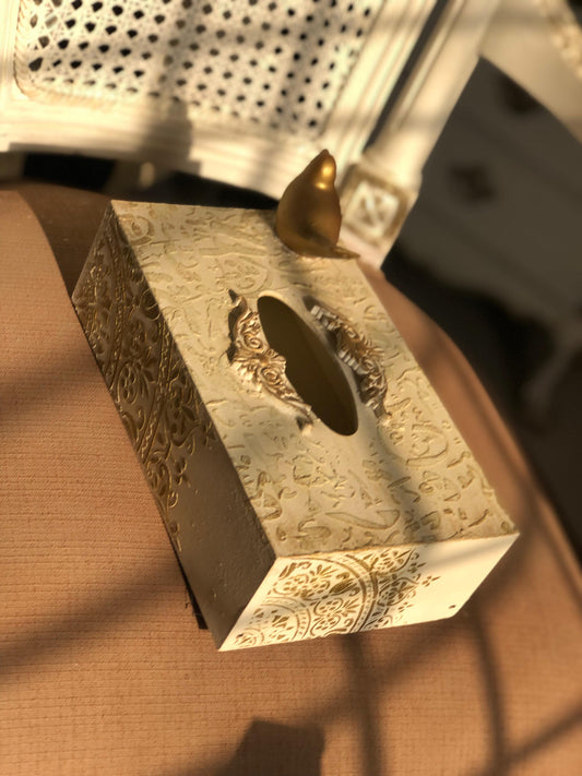 Elevate your space with this exquisitely crafted Hand-Painted Wooden Tissue Box Cover, featuring a charming bird motif and vintage detailing. This elegant piece showcases a creamy Ivory/Off-White base with rich, hand-stenciled Metallic Gold patterns wrapping around the sides. The lid is adorned with a delicate, decorative gold border around the...