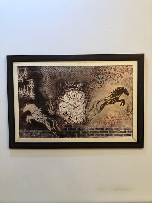 Elevate your space with this stunning handcrafted wooden framed art piece. Featuring a mesmerizing scene of powerful horses leaping alongside a grand Parisian clock and architectural silhouettes, this artwork is imbued with a sense of adventure and classic beauty. The intricate design is beautifully rendered, highlighting the warm, inviting tones....