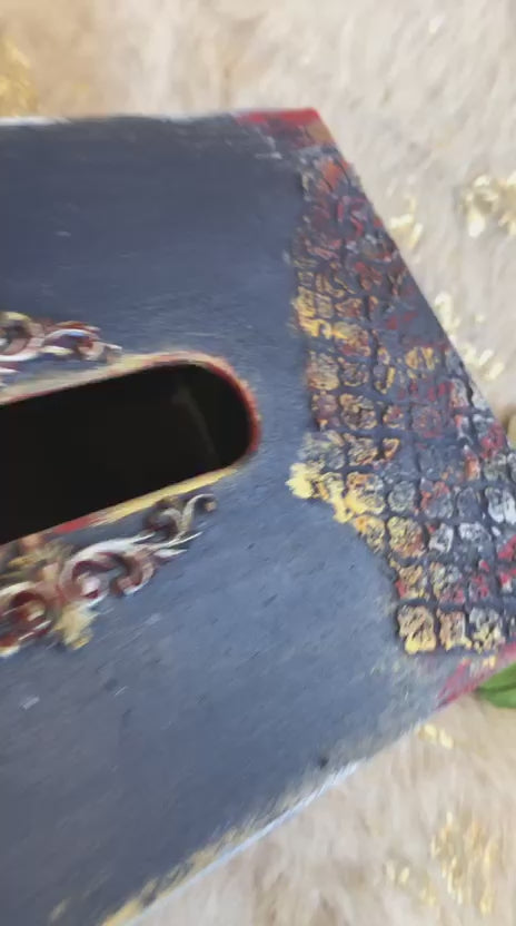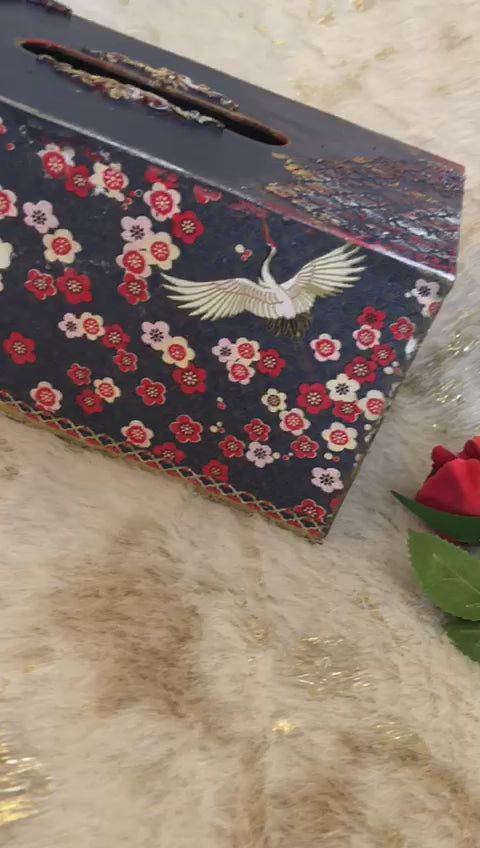 Bring elegance and artistry to your home with this handcrafted wooden tissue box, beautifully painted in rich navy blue tones. Featuring a delicate bird motif surrounded by vibrant red flowers, this unique piece blends nature-inspired charm with functional design.