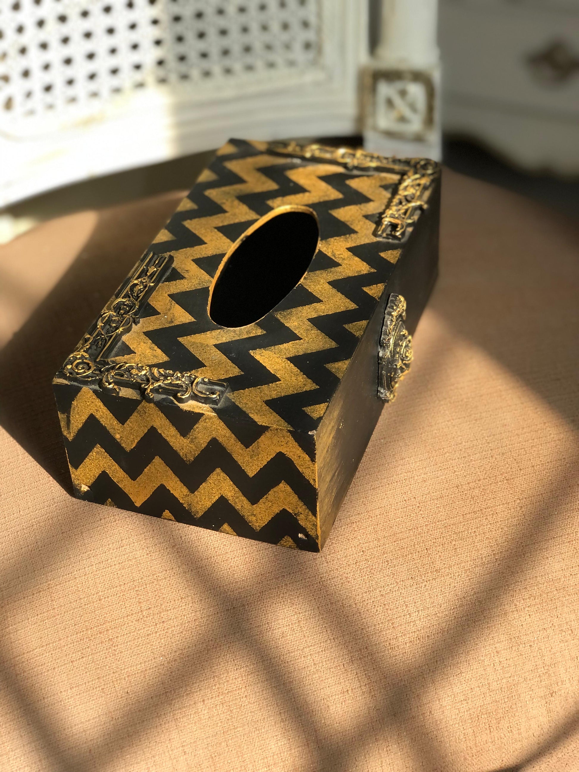 This box is a bold and glamorous statement piece, using high-contrast colors and heavy metallic accents for a luxurious look.