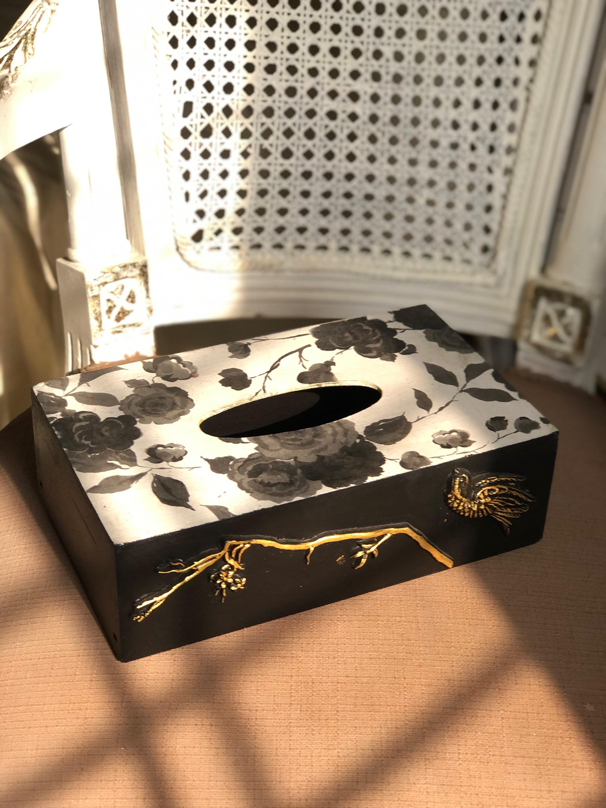 For a sophisticated, modern, yet dramatic aesthetic, choose this captivating Hand-Painted Wooden Tissue Box Cover.