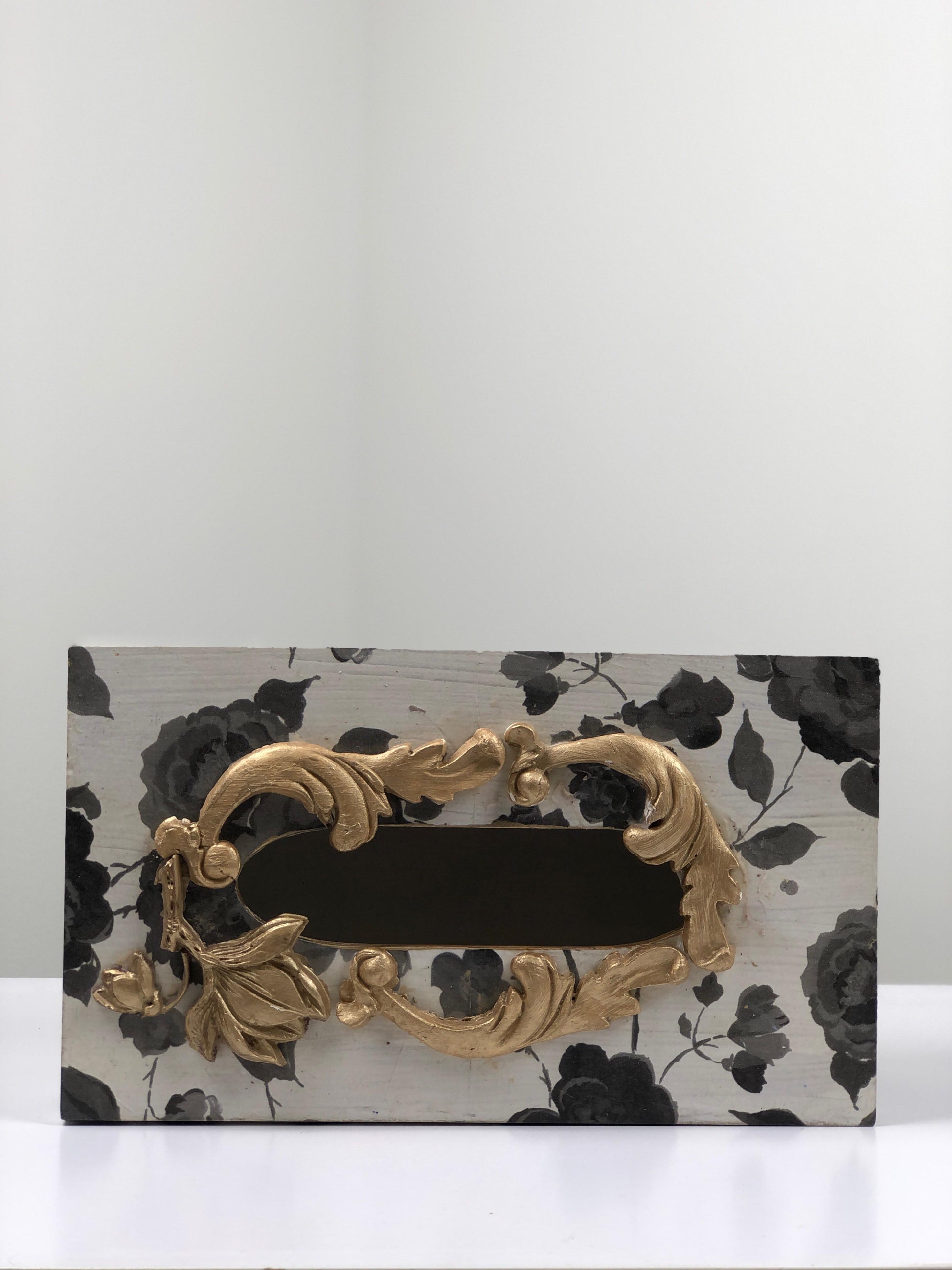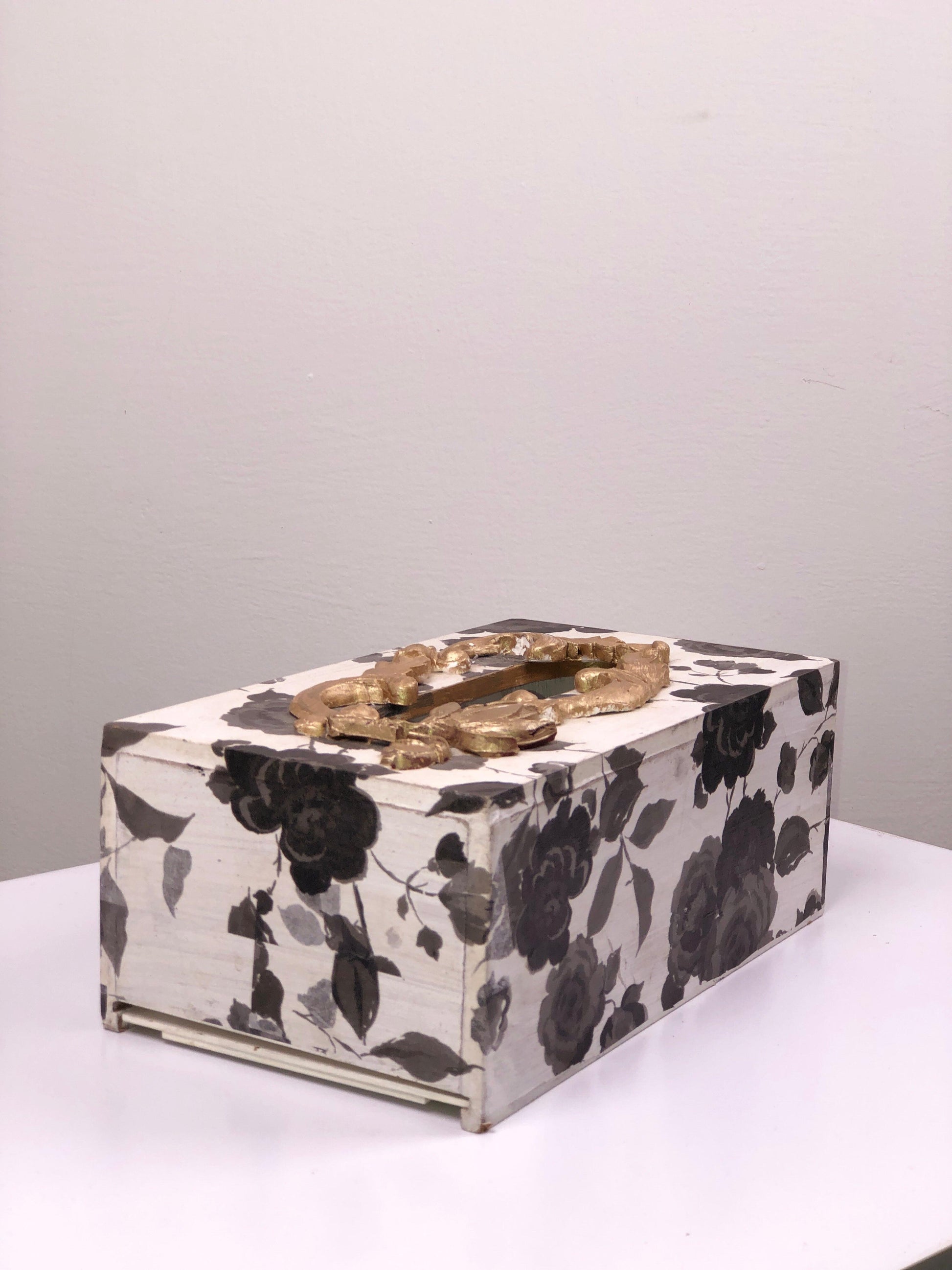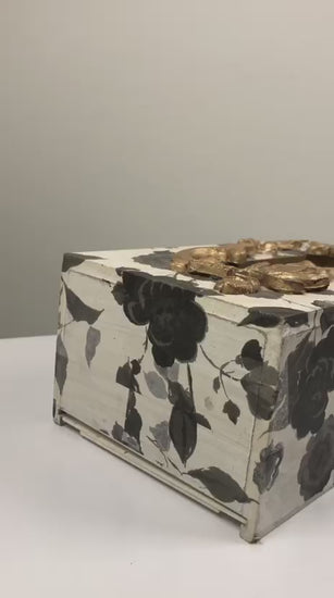 This hand-painted wooden tissue box makes a bold, sophisticated statement with its high-contrast color palette and rich, metallic embellishment.