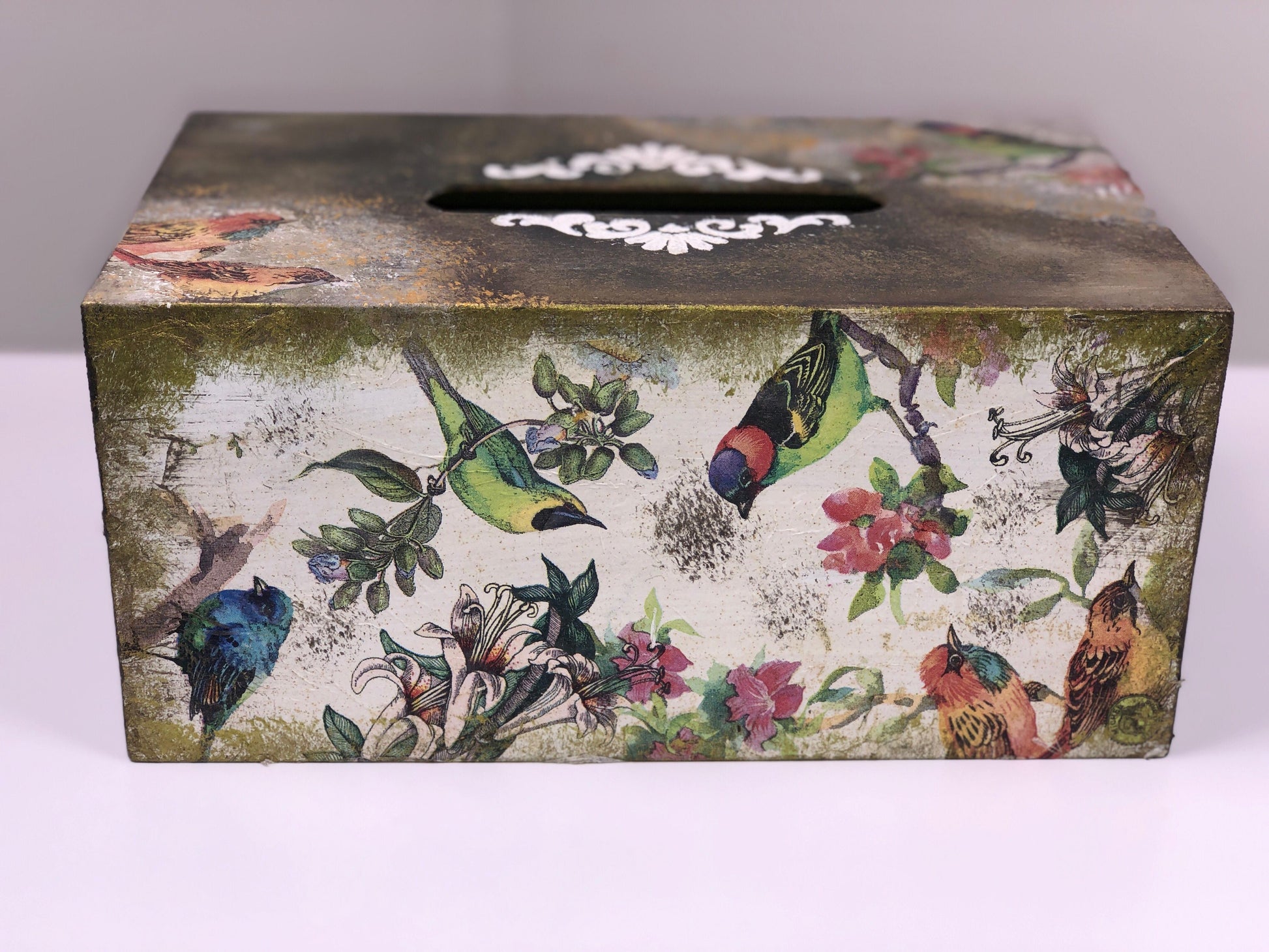 This unique wooden tissue box offers a rich, distressed look, perfect for a rustic, cottage-core, or nature-inspired décor.