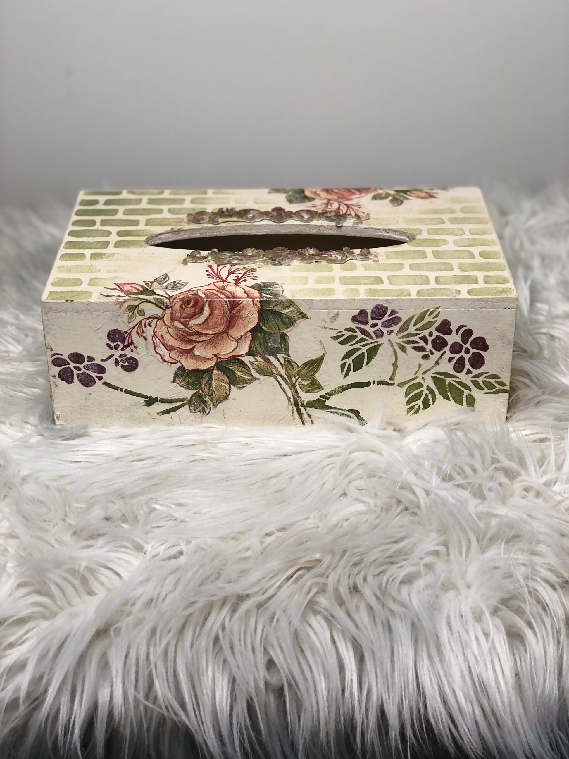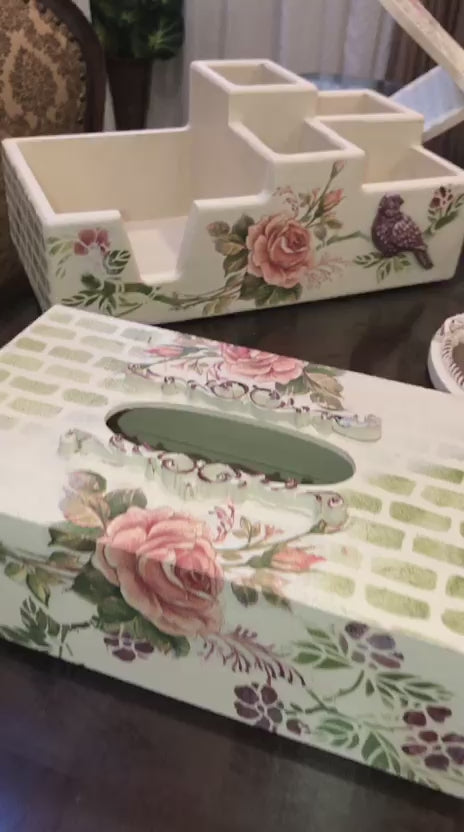 Add a touch of rustic elegance with this unique hand-painted wooden tissue box. It beautifully combines classic florals with a textured, modern background.