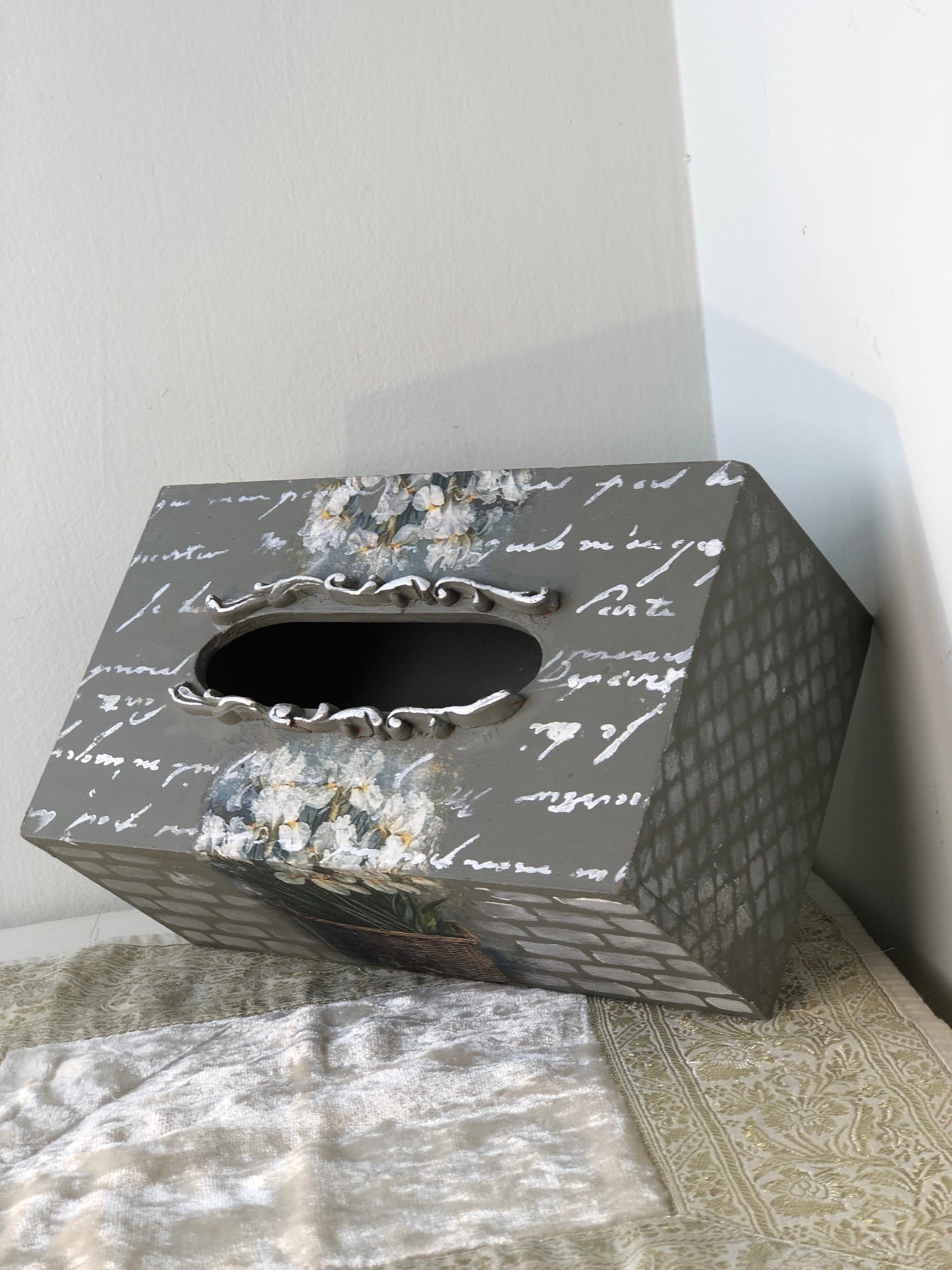 Bring a touch of classic sophistication to your home with this hand-painted wooden tissue box. The muted, stylish design blends modern colors with vintage textures.