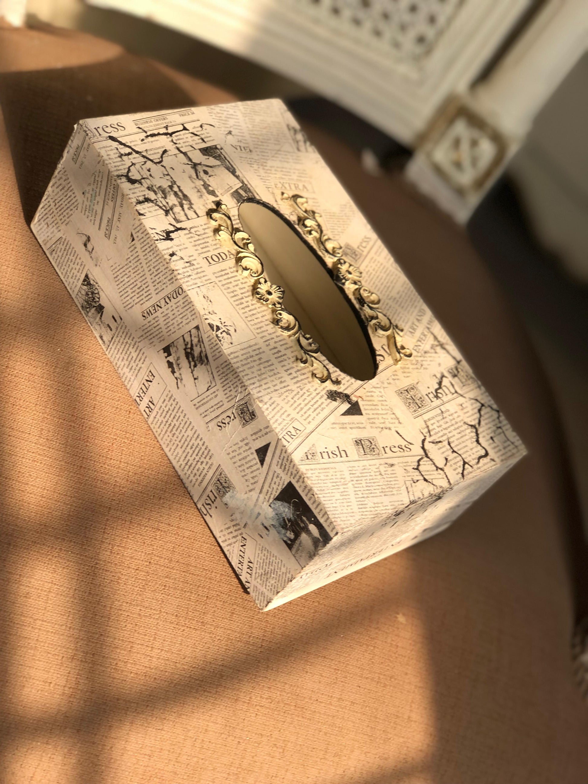 This unique wooden tissue box cover blends a trendy, journalistic theme with glamorous metallic accents.