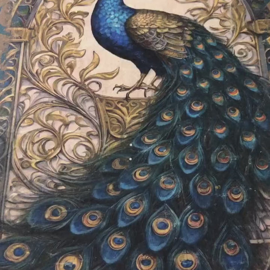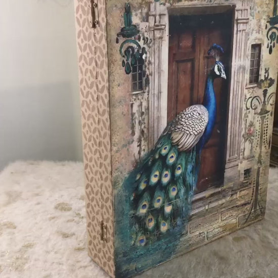 Grace your home with this hand-painted wooden décor box, featuring a majestic blue peacock design set against a warm light brown background. The box is beautifully enhanced with Urdu poetry, blending artistry, culture, and elegance in one timeless piece.