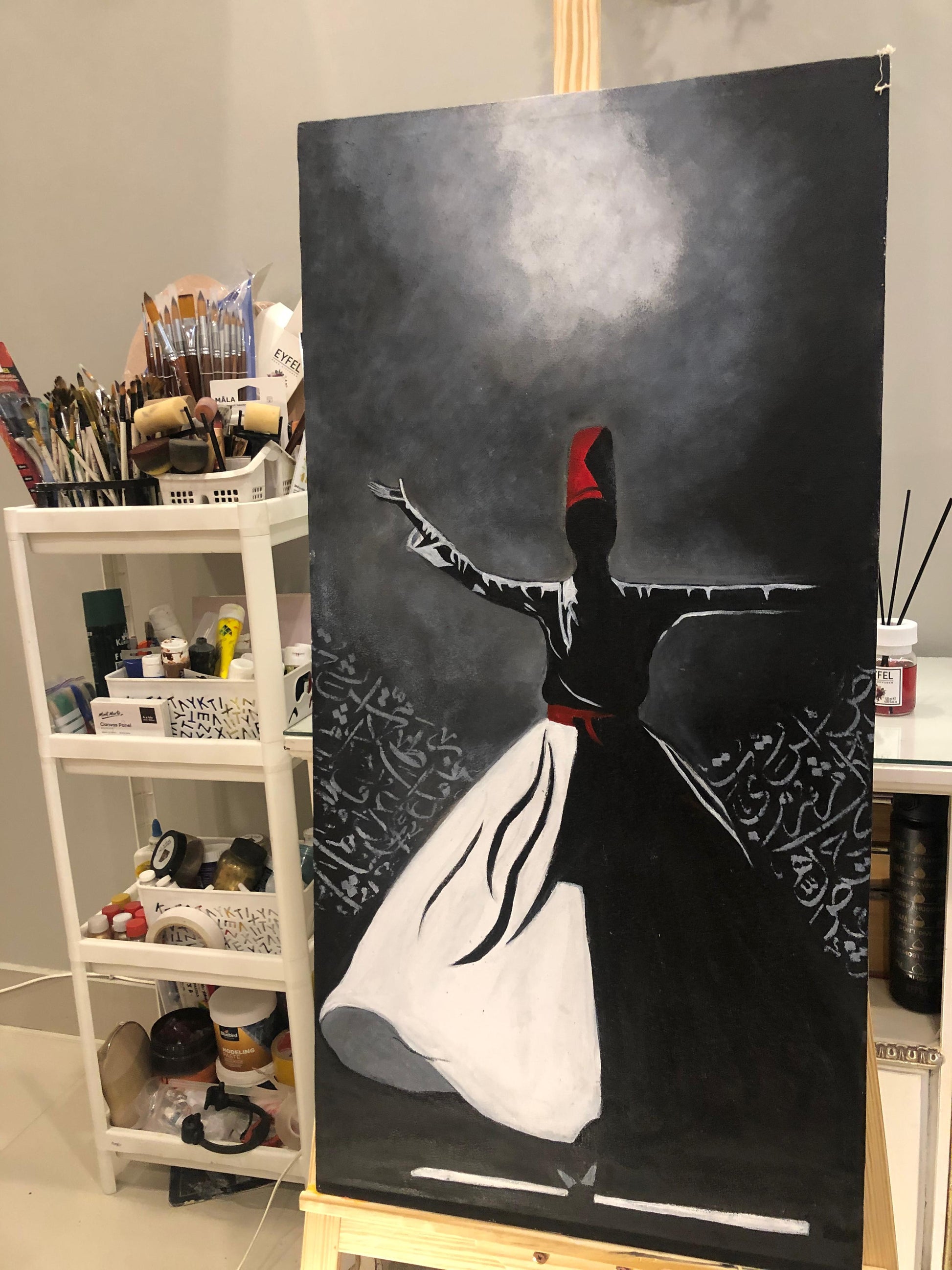 Discover the timeless beauty of this Rumi Painting for sale, a unique piece of artful wall art crafted on a large canvas, perfect for those seeking customized paintings and handmade wall hangings. This oil painting stands apart with its authentic fusion of spiritual inspiration and skillful artistry, making it a standout choice among art for sale that enriches any space with depth and meaning.