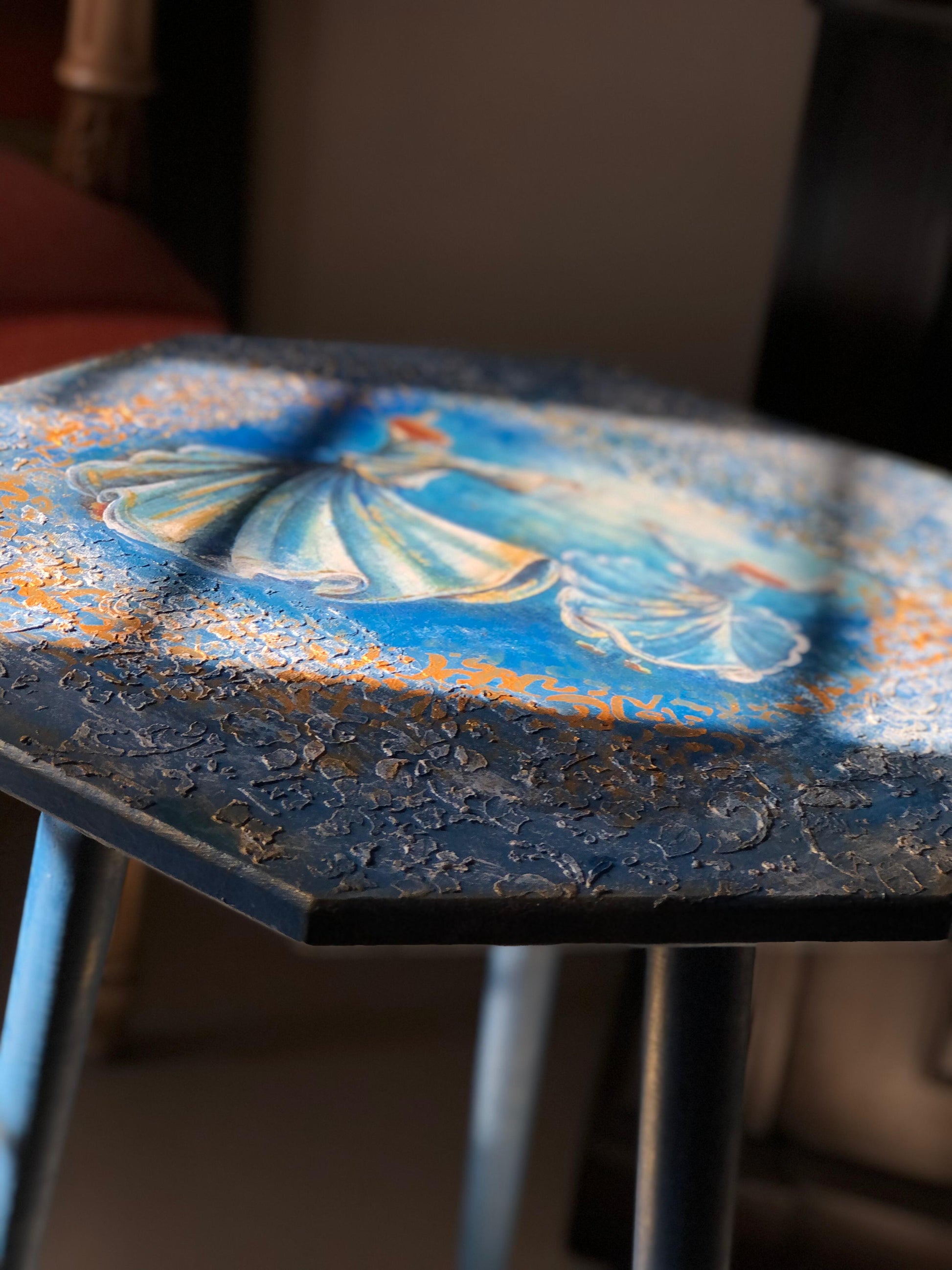 Bring mystical artistry into your living space with this hand-painted wooden octagon table, showcasing two graceful Sufi dancers in striking blue hues. The eight-sided tabletop rests on a sturdy three-leg triangular base, blending geometric elegance with spiritual symbolism.