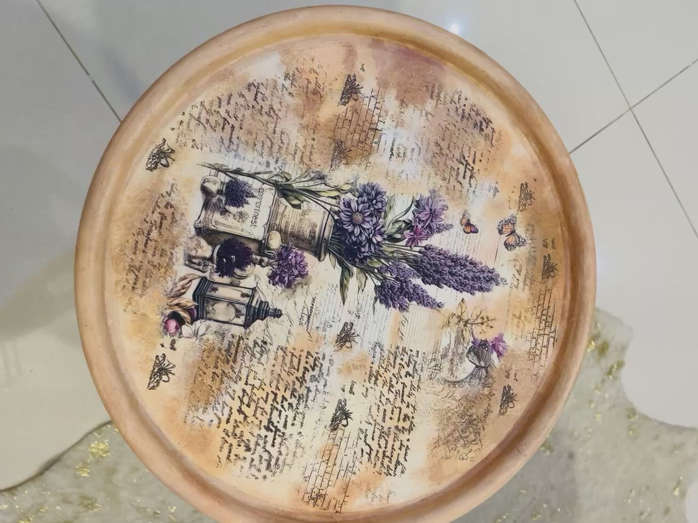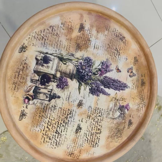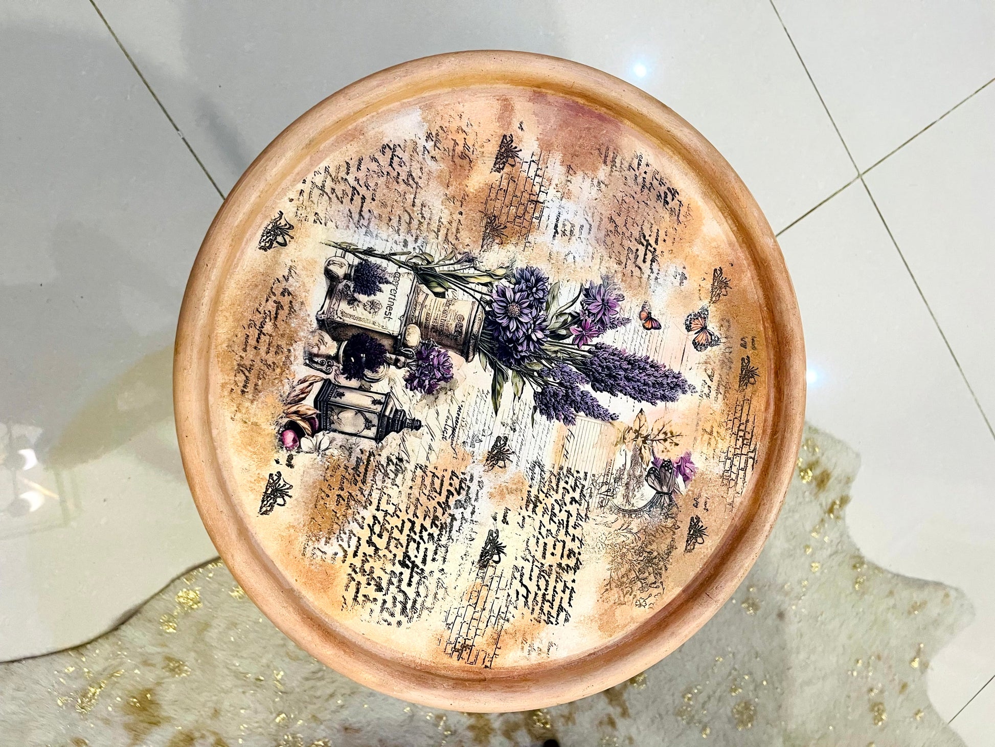 Bring soft, timeless charm to any room with this hand-painted vintage round table, featuring delicate lavender florals on a smooth wooden top. Supported by a sturdy brown triangular three-leg stand, this piece blends rustic elegance with artisan craftsmanship.